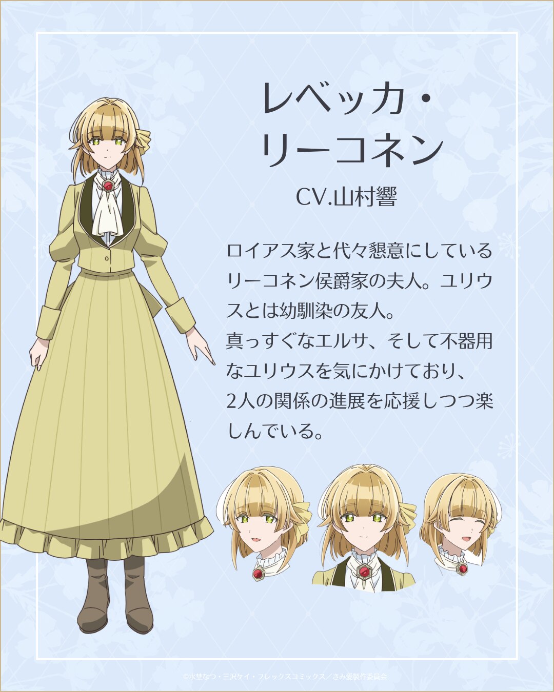 レベッカ・リーコネンは、ロイアス家と代々懇意にしているリーコネン侯爵家の夫人であり、ユリウスの幼馴染。真っ直ぐなエルサと不器用なユリウスのことを常に気にかけ、2人の関係が進展してゆく様を、温かく見守り、応援するキャラクターです。